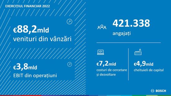 „In ciuda mediului provocator, ne putem mandri cu rezultate semnificative in 2022. In plus, am pregatit terenul pentru succesul Bosch pe pietele viitorului”, a declarat Dr. Markus Forschner, directorul financiar al Robert Bosch GmbH. In total, compania a cheltuit peste 12 miliarde de euro anul trecut pentru a-si asigura viitorul. Cheltuielile pentru cercetare si dezvoltare au crescut la 7,2 miliarde de euro (de la 6,1 miliarde de euro in 2021), sau 8,2 procente din vanzari (7,8 procente in 2021). Cheltuielile de capital au crescut, de asemenea, cu un miliard de euro, la 4,9 miliarde de euro. Rata capitalului propriu a crescut usor la 46,6 procente (2021: 45,3 procente). Pe langa investitiile initiale, nevoia de mentinere a capacitatii companiei de a livra in vremuri de mare incertitudine a dus la blocarea fondurilor. Acest lucru a avut drept rezultat anul trecut un flux de numerar liber negativ de 4,0 miliarde de euro. Dupa cum a subliniat Forschner: „Chiar daca Bosch are fondurile necesare si o pozitie financiara foarte solida, trebuie sa mentinem un echilibru dificil intre investitii si disciplina costurilor”.