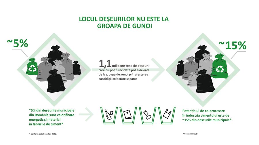 Industria de ciment din Romania inlocuieste aproximativ 40% din energia obtinuta din combustibili fosili traditionali (carbune/cocs) cu resurse alternative provenite din deseuri. Astfel, nu se mai depoziteaza aproximativ 600.000 tone deseuri/an, se salveaza aproximativ 350.000 tone/an de combustibili fosili si se evita generarea a aproximativ 350.000 tone/an de CO2.