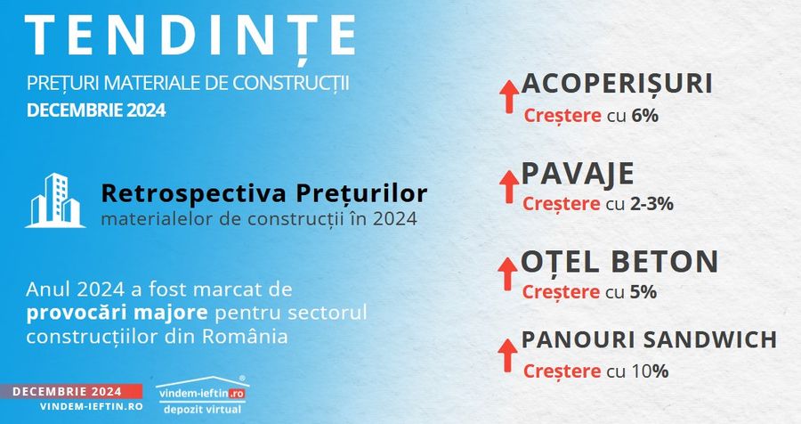 "In fata dificultatilor financiare si a presiunii provocate de conditiile economice din 2024, companiile de constructii se confrunta cu blocaje severe, de la intarzieri ale platilor din partea statului, pana la costuri financiare ridicate impuse de banci si distribuitori. Noi, la vindem-ieftin.ro, venim in sprijinul lor printr-un model de business inovator, care simplifica procesul de achizitie si creditare si ofera solutii de finantare mai flexibile pentru clientii cu bonitate buna. Pentru a sustine companiile de constructii, am consolidat colaborarea cu furnizorii si subcontractorii prin negocierea de contracte avantajoase si asigurarea aprovizionarii stabile cu materiale de constructii. Credem ca transparenta si sustinerea pe termen lung sunt esentiale pentru a depasi aceasta perioada dificila. Investitiile in tehnologie, sustenabilitate si resurse umane ne vor permite sa oferim clientilor nostri solutii complete si eficiente, chiar in conditii economice dificile. Industria constructiilor din Romania a demonstrat o rezilienta remarcabila in fata provocarilor din 2024, dar, pentru a ramane competitiva, va trebui sa continue sa investeasca in sustenabilitate, sa adopte noi tehnologii si sa construiasca parteneriate solide. 2025 va fi despre echilibru intre costuri, cerere si sustenabilitate. Este esential sa ramanem uniti ca industrie si sa punem accent pe transparenta si colaborare", a declarat Cosmin Raileanu, fondator si CEO Vindem-Ieftin.ro.