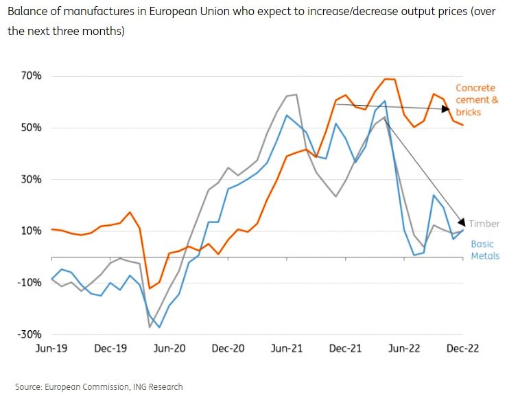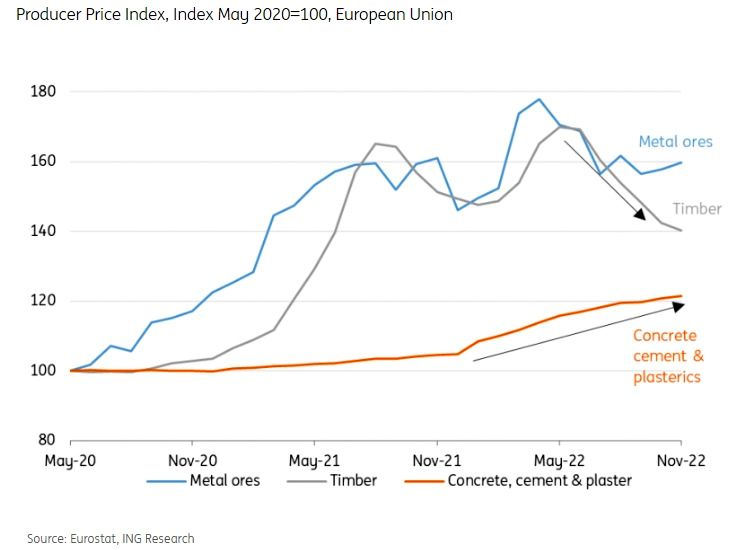Cu toate acestea, nu toate materialele de constructii sunt mai ieftine. Preturile in mod normal stabile ale betonului, cimentului si caramizilor au crescut constant in 2022 din cauza scumpirii energiei, deoarece procesele de productie ale acestor materiale sunt mari consumatoare de energie. Costurile temporare de transport mai mari, din cauza nivelului scazut al apelor in multe rauri europene in timpul verii 2022, au accelerat cresterea acestor costuri. Preturile energiei (in special al gazelor) au scazut foarte mult, insa, in ultimele luni, ceea ce ar trebui sa puna presiune pe reducerea pretului cimentului, betonului si caramizii. Cu toate acestea, un numar aproape record de furnizori specializati au declarat, in decembrie 2022, ca planuiesc sa-si creasca in continuare preturile de vanzare. In schimb, multi furnizori de produse din lemn si metale au planificat sa creasca preturile in vara anului 2022, dar in pana la finalul anului trecut planurile de crestere a preturilor lor de productie nu s-au materializat, mai noteaza analistul ING Research.