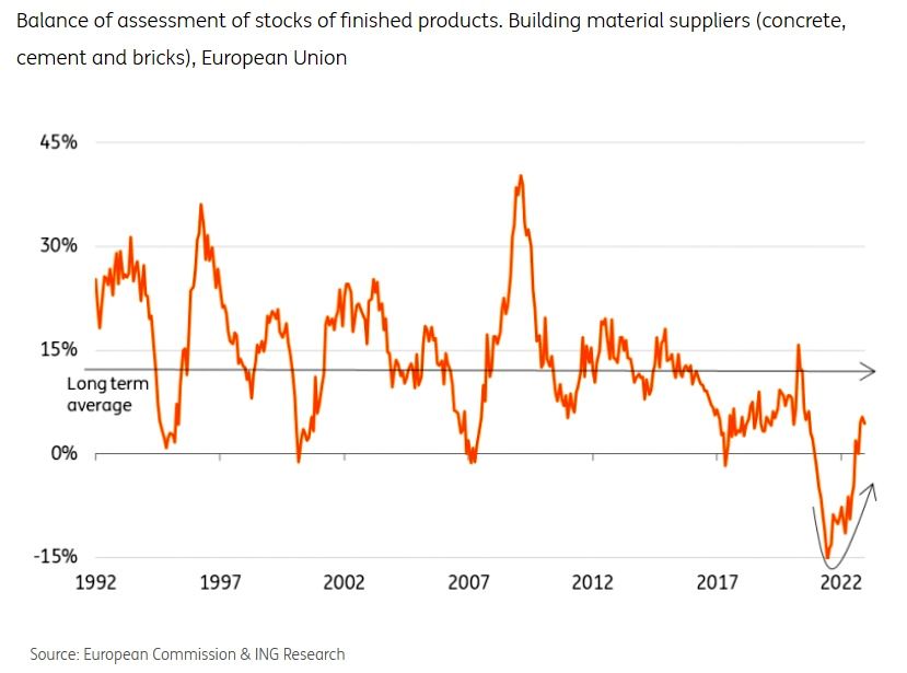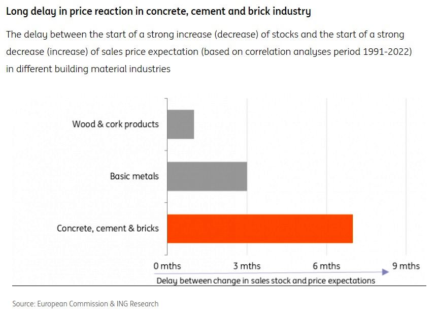 Analistii ING Research arata ca materialele de constructie precum cimentul, betonul si caramida reactioneaza cu o intarziere de peste sase luni la modificarile in evaluarea stocurilor lor, din motivele mentionate mai sus. Stocurile acestor materiale au inceput sa creasca de la inceputul trimestrului al treilea al anului 2022, ceea ce ar insemna ca preturile acestor produse vor incepe sa scada in curand. Cu toate acestea, stocurile sunt inca la niveluri reduse, iar preturile de intrare la energie (in principal gaz) raman ridicate, desi acestea au scazut din august 2022. Prin urmare, analistii ING Research considera ca abia cel mai devreme in primavara acestui an preturile betonului, cimentului si caramizii vor inregistra primele scaderi, dar numai cu conditia esentiala ca preturile la energie sa nu creasca din nou.