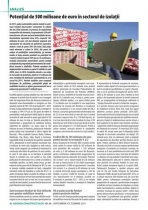Colectia de articole tematice include materialele redactionale publicate in cadrul revistei Agenda Constructiilor la sectiunea dedicata analizelor de piata anuale in domeniu. Sunt incluse date statistice, analize si comentarii ale reprezentantilor companiilor: Adeplast, Austrotherm Com, Baumit, Baumix, Duraziv, Rockwool, Amvic, Arcon, Arabesque, Bico Industries, Bima Consulting, Air Flex, Saint-Gobain, Izocam, Knauf Insulation, Uralita, Recticel, Hirsch Porozell, USG Corporation, Dow si altele. In 2011, piata materialelor pentru izolatii a continuat trendul descrescator consemnat in ultimii doi ani, fiind estimata, in prezent, de majoritatea companiilor din domeniu, la aproximativ 220 milioane de euro, din care sectorul materialelor termofonoizolante reprezinta circa 65%, respectiv 143 milioane de euro. Cel mai dinamic segment este reprezentat de vanzarile de polistiren expandat, avand o cota de peste 50% din total. Desi piata vatei minerale a scazut in 2010, din punct de vedere al cantitatilor comercializate, pe termen mediu si lung aceasta prezinta un potential de crestere evaluat la peste 10% pe an. In continuare, evolutia domeniului materialelor pentru izolatii va depinde de programul guvernamental de reabilitare termica a cladirilor. Primele rezultate ale implementarii acestuia au putut fi vizibile in anul 2009, insa, in 2010, fondurile alocate s-au redus la mai putin de jumatate, pana la 35 milioane de euro, tendinta de diminuare accentuandu-se si in cursul lui 2011. Potrivit studiilor unor companii furnizoare de polistiren, potentialul pietei de reabilitari termice cu ajutor guvernamental are o valoare de aproximativ 7 miliarde euro. In pofida faptului ca piata izolatiilor nu a dat semne de revigorare in primele luni ale anului in curs, managerii celor mai importante firme din domeniu estimeaza ca domeniul termo-fonoizolatiilor va inregistra un ritm anual de crestere de 10%-12% in perioada 2011 - 2012, in timp ce piata polistirenului (expandat si extrudat) se va majora cu 14%-15% pe an. Din punct de vedere al potentialului, studii provizorii indica faptul ca valoarea sectorului de vata minerala ar putea spori pana la 150 milioane de euro, in timp ce, datorita necesitatii de implementare a programului de reabilitare termica, segmentul de polistiren s-ar putea situa la 350 milioane de euro. Pentru informatii suplimentare, click aici! ABONARE REVISTA (click aici): PROIECTE | INVESTITII | REVISTE | INDEX COMPANII