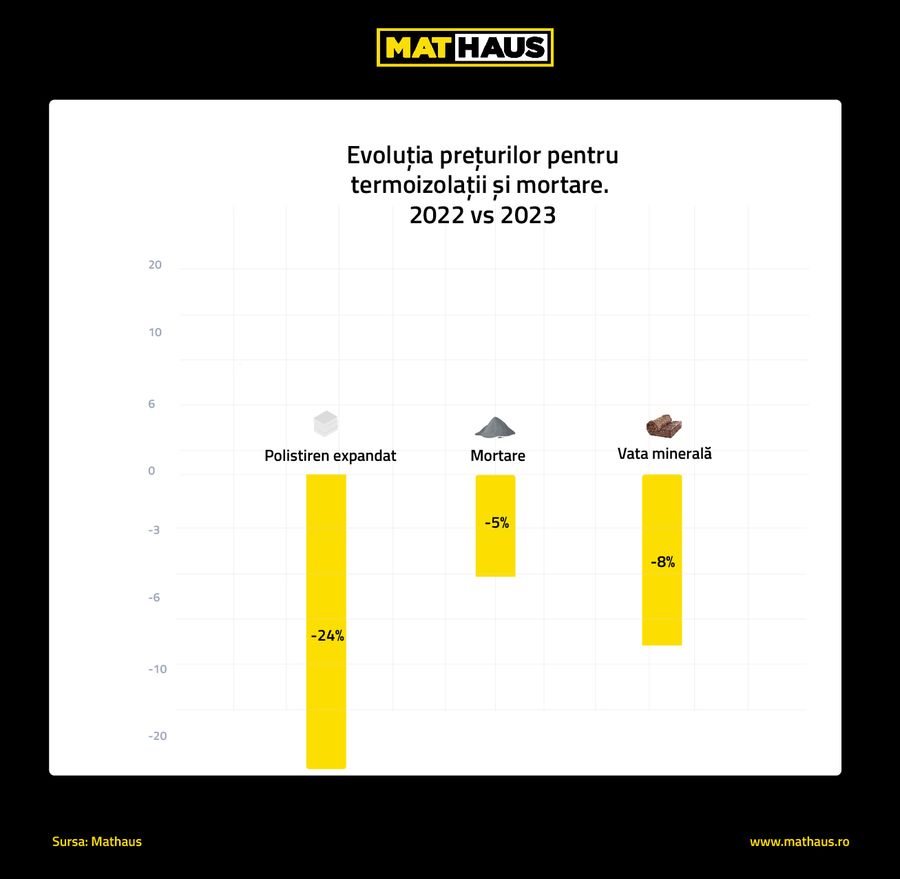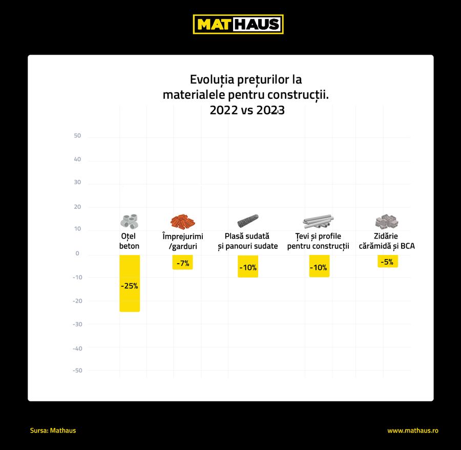 Preturile materialelor de constructii si ale materiilor prime pentru mobilier au inregistrat scaderi majore incepand cu a doua jumatate a acestui an, arata o analiza facuta de retailerul in domeniu, Mathaus. In 2023, cele mai importante ajustari ale preturilor au fost inregistrate la materiile prime pentru mobilier, unde materiale precum PAL sau MDF au fost vandute cu 30%, respectiv 34% mai ieftin fata de perioada similara din 2022. Alte materiale ale caror preturi au scazut cu pana la 25% sunt otelul beton si materialele pentru realizarea termosistemelor. Specialistii Mathaus sustin ca exista o tendinta de scadere a preturilor, acest lucru impulsionand proiectele clientilor si planurile de renovare sau amenajare a locuintei.
