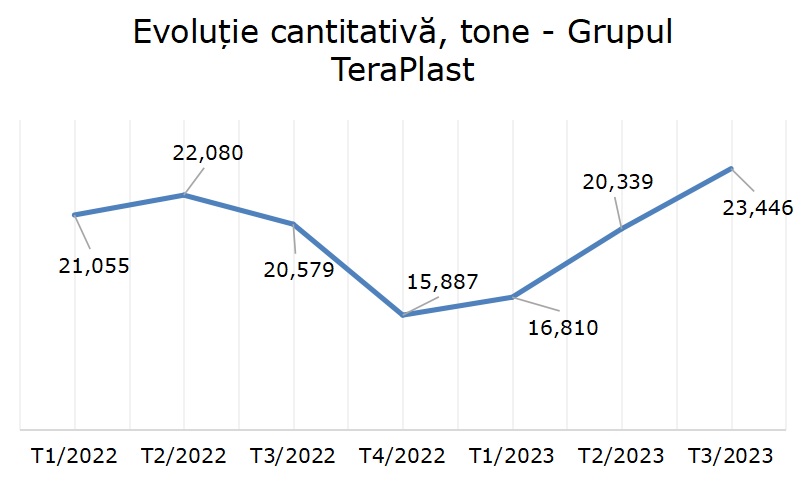 Activitatea Grupului TeraPlast a accelerat in T3/2023 cu o viteza suplimentara imprimata de cresterea lucrarilor de infrastructura si a exporturilor, insa sunt inca vizibile limitari de potential date de evolutia sub asteptari a business-urilor din subsidiare (segmentele ferestre si usi si ambalaje flexibile). Principalii indicatori financiari sunt sub nivelul primelor 9 luni din 2022, insa asteptarea managementului este ca acest ecart sa fie recuperat pana la finalul anului. Cifra de afaceri consolidata a ajuns la 517 milioane de lei, cu 8% sub nivelul inregistrat in primele 9 luni din 2022, iar EBITDA, situata la 45 milioane de lei, este cu 7% sub evolutia din aceeasi perioada a anului trecut. Rezultatul net a ajuns dupa trei trimestre in teritoriu pozitiv la nivel consolidat, la aproape 7 milioane de lei. Exporturile Grupului TeraPlast au ajuns la 17% din cifra de afaceri, cu o valoare de 87 de milioane de lei.