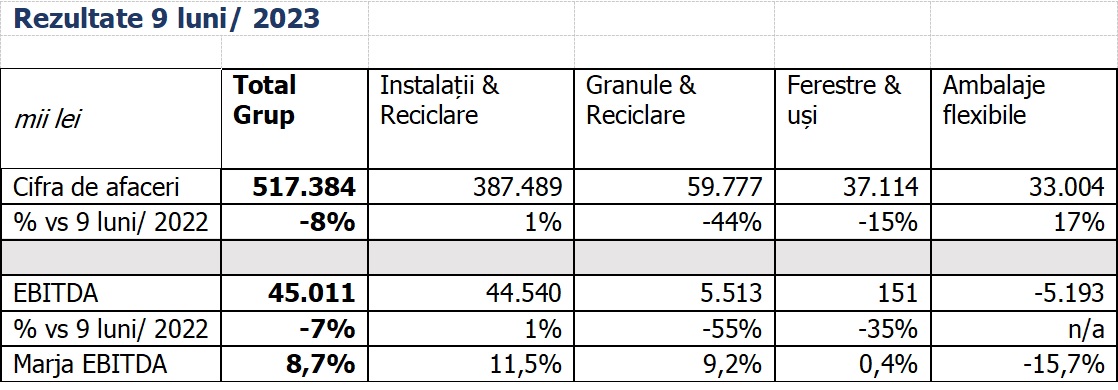 "Am cunoscut o cerere consistent mai buna aparuta ca urmare a dezvoltarii mai accelerate a proiectelor de infrastructura care s-au inscris pe traiectoria pe care ne-o doream de anul trecut. Din pacate, celelalte segmente desi sunt in general pe un trend pozitiv trimestrial nu evolueaza la nivelul asteptat. Ne continuam concentrarea in actualul context pe eficientizarea activitatii si o rentabilizare a acestor linii de business care sufera si din cauza contextului nefavorabil.” a declarat dna Ioana Birta, director financiar al Grupului TeraPlast. In primele 9 luni din 2023, segmentul de Instalatii si Reciclare, cel mai solid segment al Grupului, a avut o evolutie usor peste aceeasi perioada din 2022, cu cea mai mare pondere in rezultatele consolidate. Cifra de afaceri, care a ajuns la 387 milioane de lei, si EBITDA, la 44,5 milioane de lei, sunt cu 1% peste primele 9 luni din 2022, in timp ce marja EBITDA s-a pastrat la o valoare de doua cifre, la 11,5%.
