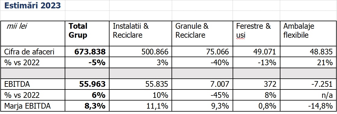 Astfel, pentru anul 2023, Grupul TeraPlast estimeaza o cifra de afaceri de 673,8 milioane de lei si o EBITDA de 56 milioane de lei, motorul Grupului fiind in continuare segmentul Instalatii & Reciclare. Pentru aceeasi perioada, marja EBITDA la nivel de Grup este estimata la 8,3%, fata de 7,4% la finalul anului 2022, pe fondul imbunatatirii usoare a marjelor si a EBITDA pentru segmentele Ferestre si Usi si Ambalaje flexibile. Efectul cererii scazute este asteptat sa continue pana la finalul anului pentru segmentul Granule si Reciclare, aspect care se reflecta si in rezultatele estimate, insa care este asteptat sa se amelioreze de la inceputul anului viitor.