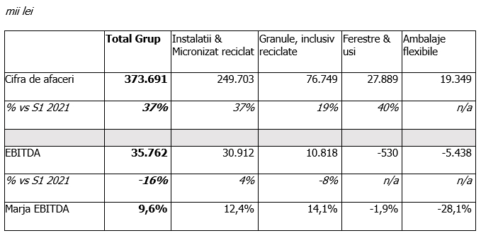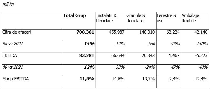 Noua proiectie pentru 2022 are in vedere o crestere cu 15% a cifrei de afaceri, cu 12% a EBITDA comparativ cu 2021 si mentinerea unei marje EBITDA pentru intreg Grupul de doua cifre, respectiv 11,8%. Principalele surse de crestere raman Instalatiile si Reciclarea, iar un efect pozitiv este asteptat dintr-o potentiala redinamizare a lucrarilor de infrastructura in a doua parte a trimestrului 3. Pentru linia de Granule, Grupul isi propune o EBITDA de de peste 20 milioane de lei si o marja de 13,7%. Profitul net va fi similar celui de anul trecut, cand Grupul a inregistrat un profit net din activitatea operationala de 42,3 milioane de lei.