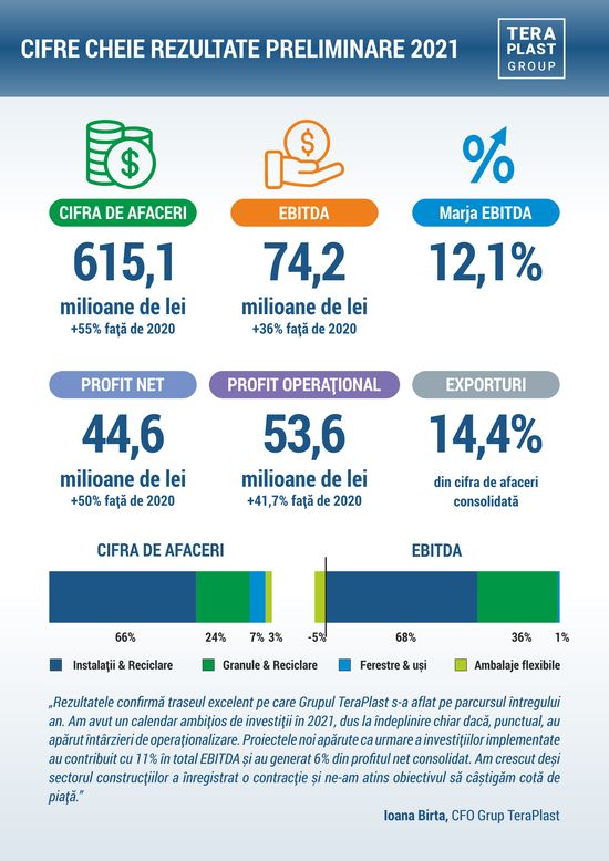 Grupul TeraPlast a continuat performanțele solide în anul 2021, cu creșteri substanțiale, de două cifre, la toți indicatorii de performanță. Cifra de afaceri aferentă exercițiului financiar 2021 a crescut cu 55%, la 615 milioane de lei - un rezultat record în actuala structură a Grupului. Profitul net (care nu include impactul exiturilor din 2021) a urcat cu 50%, până la 44,6 milioane de lei. EBITDA a ajuns la 74,2 milioane de lei, în creștere cu 36% față de anul anterior. În aceeași perioadă, profitul operațional a ajuns la 53,6 milioane de lei, cu 41,7% mai mult decât în 2020 și triplu față de 2019.Rezultatul consolidat a fost influențat pozitiv de operaționalizarea unor investiții programate (extinderea capacităților Diviziei Instalații și a TeraPlast Recycling), dar a fost grevat de costuri nerecurente aferente pornirii investițiilor noi, care s-au cifrat la aproape 3,7 milioane de lei.