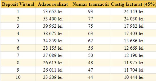 Modelul poate aduce venituri semnificative. In primele sase luni din 2023, cele 45 de Depozite Virtuale active au generat castiguri facturate de catre francizati de 778.800 de lei. Tinand cont de faptul ca din 1 iulie 2023 a crescut grila de comisionare pentru toate Depozitele Virtuale active la 45% si daca s-ar pastra aceleasi adaosuri, castigurile facturate ar fi de 1,06 milioane de lei.