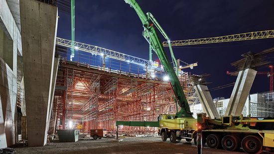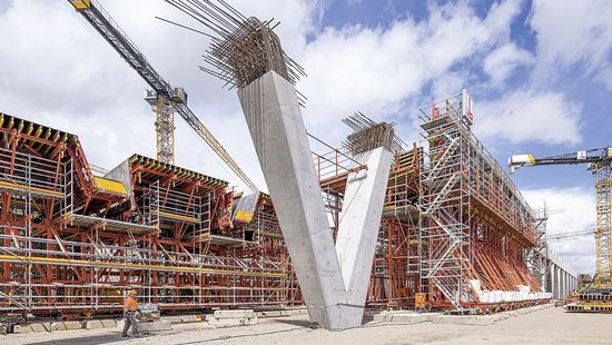 Cofrajele grinzilor oblice si in forma de V ale platformei de trecere a reprezentat o provocare deosebita. In acest caz, a fost necesara blocarea si lovirea grinzilor separat de caruciorul de cofraj – si intr-o zona foarte restransa. Acest lucru a fost realizat prin intermediul unui mecanism de pliere si al cofrajului MAXIMO Structure Panel datorita inaltimii mai mici de constructie in comparatie cu cofrajul grinzii. De asemenea, MAXIMO Structure a facut posibila atingerea clasei de beton arhitectural SB2 dorita. Cofrajul cu grinzi a fost operat de pe o Platforma PERI UP amplasata in burta caruciorului de cofraj. Pentru a indeplini toate cerintele de securitate a muncii, toate punctele de acces si platformele de lucru din caruciorul de cofraj au fost construite folosind Kit-ul de schele PERI UP.