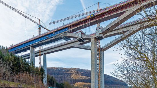 Pentru a accelera considerabil procesul de constructie, platformele de lucru de pe suprastructura de est au fost tinute la dispozitie pe toata lungimea podului astfel incat parapetul sa poata fi construit in sectiuni. Solutia VARIOKIT specifica proiectului de la inginerii PERI a luat in considerare aici si aplicatiile suplimentare de asamblare si finisare ale platformei. Grila de baza metrica a ambelor sisteme modulare, VARIOKIT si PERI UP, a deschis calea pentru un numar aproape nelimitat de combinatii din toate punctele de vedere, ceea ce a fost extrem de benefic pentru planificare, analiza structurala si lucrarile de constructie la fata locului. Pentru aceasta, partenerii consortiului Max Bögl si PORR au avut alaturi un subcontractant competent in Schafer Gerüstbau, care a avut deja experiente pozitive cu ambele sisteme PERI in timp ce efectua lucrari de asamblare pe nenumarate santiere. Cu procese de lucru sigure si coordonate, termenele convenite ar putea fi respectate fara intreruperi care ar putea intarzia constructia. Nivelul ridicat de siguranta in lucru a facilitat atat procesele de asamblare a cofrajelor si a schelelor, cat si utilizarea ulterioara la inaltimi mari si in zona trecerii autostrazii de la Drackensteiner Hang pe A8.