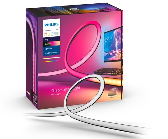Noua banda luminoasa cu gradient Philips Hue Play pentru PC aduce o experienta luminoasa de ultima generatie pentru jocurile pe PC. Benzile luminoase gradient produc mai multe culori in acelasi timp, creand un gradient perfect de lumina intensa, de inalta calitate. Culorile curg in mod natural imbinandu-se pentru a crea un efect cu adevarat captivant. Philips Hue Play, banda luminoasa cu gradient pentru PC, pulseaza, danseaza, scade sau creste intensitatea luminoasa odata cu actiunea de pe ecran, creand o experienta de joc captivanta. Banda luminoasa Play gradient se ataseaza pe partea din spate a monitorului cu ajutorul suportilor inclusi si creeaza o aura atunci cand monitorul este plasat aproape de un perete, datorita designului la 45 de grade al suportilor. Datorita flexibilitatii benzii luminoase, aceasta poate fi instalata pe monitoarele drepte sau curbate si este disponibila in trei dimensiuni diferite - o banda luminoasa de 24/27 de inch si o banda luminoasa de 32/34 de inch pentru configuratii cu un singur monitor, precum si o banda mai lunga conceputa pentru birourile cu trei monitoare care utilizeaza ecrane de 24/27 de inch.