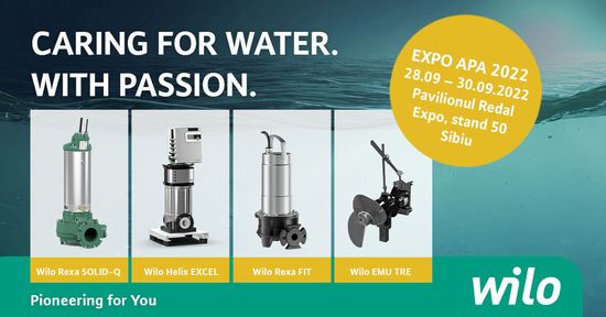 Clientii Wilo Romania beneficiaza de cele mai noi tehnologii de-a lungul intregului ciclu al apei, atat pentru aprovizionarea cu apa, cat si pentru eliminarea apelor uzate. Compania ofera sprijin amplu, de la proiectare pana la implementare, chiar si pentru proiecte complexe. La Expo Apa 2022 din Sibiu, vor mai fi prezentate: