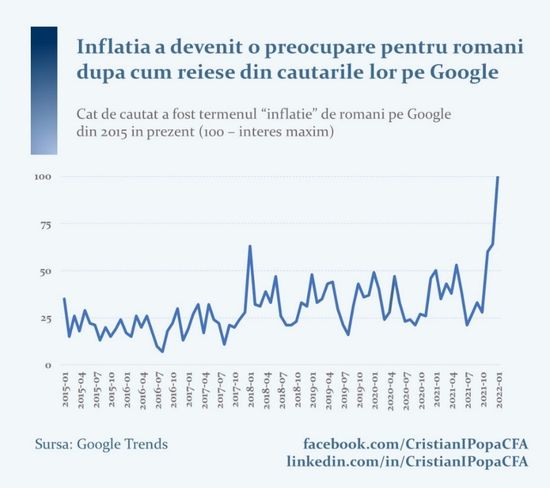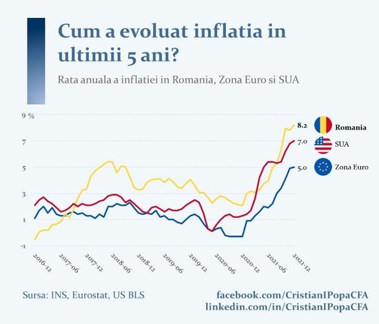 Conform ultimelor date, in SUA inflatia a atins maximul ultimilor 40 de ani, 7%. In zona euro, inflatia a atins maximul de la crearea euro, 5%. In Romania nivelul atins recent, 8,2%, sub impulsul unei liberalizari grabite a preturilor la energie, nu a mai fost inregistrat de peste un deceniu. Evolutiile recente sunt elocvente dupa cum se poate observa in infograficul de mai jos.