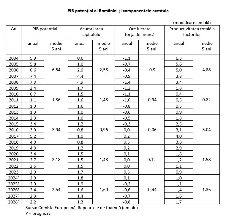 Este adevarat ca nici PIB-ul potential, nici cei trei factori care il compun nu sunt marimi observabile, ci pot fi doar estimate, cu un grad mai mare sau mai mic de precizie. Tocmai de aceea, pentru a nu fi acuzati de vreun parti pris, prezentam in tabelul de mai jos estimarile Comisiei Europene privind PIB-ul potential al Romaniei si componentele acestuia, din Rapoartele de toamna ale institutiei.