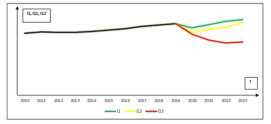 * Nota: sunt folosite date AMECO (ale Comisiei Europene) pentru traiectoria PIB (Q) real UE exprimat in PPS, iar pentru Q1 si Q2 sunt prezumate alte ritmuri de evolutie pentru a evidentia diferente intre cele 3 traiectorii. Nu sunt prezentate cifre concrete deoarece exercitiul are semnificatie numai euristica.