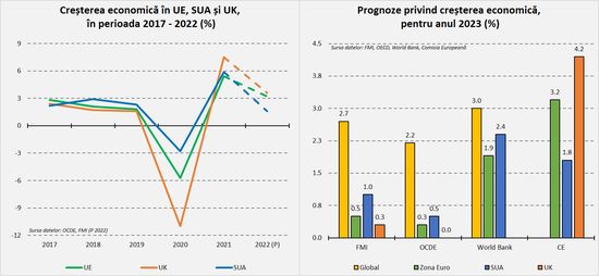 FMI si OCDE au retrogradat estimarile de crestere economica globala pentru 2023, iar estimarile pentru SUA, Zona Euro si UK sunt destul de modeste. Riscurile recesioniste sunt preconizate a fi perspectiva dura cu care unele economii se vor confrunta in continuare.Romania nu face parte din aceste scenarii recesioniste, insa nu pot fi excluse anumite efecte de contagiune, de natura sa incetineasca unele categorii de exporturi si cresterea economica estimata pentru anii urmatori.