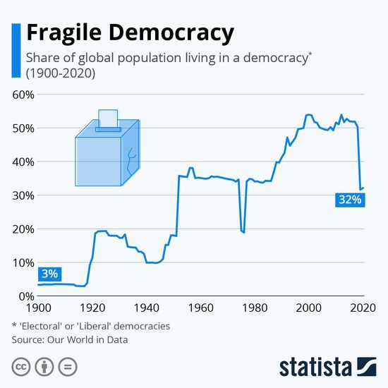 Democratia, in sensul pe care natiunile trans-atlantice i-l dau face pasi inapoi: potrivit Freedom House din 146 de state cu peste 2 milioane de locuitori, fiecare, doar 39 erau considerate, in 2020, ca raspunzand criteriilor de caracterizare a democratiei, fata de 43 cu un inainte. Mai mult, numarul statelor in care sunt recunoscute institutii democratice puternice, aparate de o populatie cu varsta mediana de 35 de ani este si mai mic.