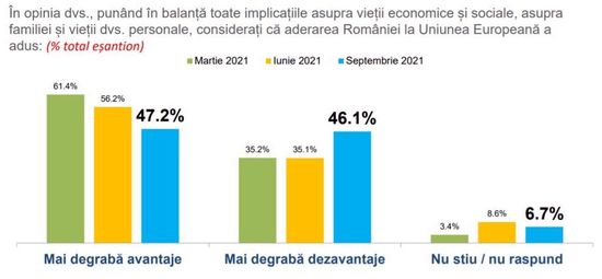 Toboganul increderii in UE: tot mai putini romani considera ca aderarea Romaniei la UE a adus tarii mai mult avataje decat dezavantaje. In septembrie 2021, 47,2% dintre cei chestionati au optat pentru mai degraba avantaje, in declin evident fata de lunile iunie (56,2%) si martie (61,4%).