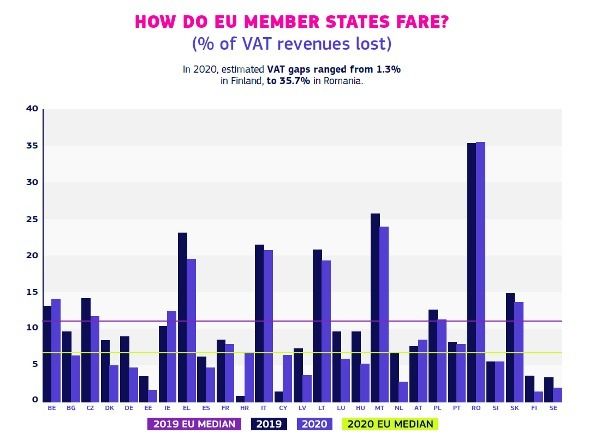 Pozitia Romaniei pe ultimul loc in acest clasament a fost constanta, de altfel, in ultimii 10 ani, incepand cu 2012, desi restul statelor membre au inregistrat progrese uriase in cresterea gradului de colectare a taxei pe valoarea adaugata. An de an, Romania a pierdut, si pierde in continuare, sume uriase reprezentand TVA necolectata la bugetul de stat, doar la nivelul anului 2020 aceasta pierdere fiind estimata la 7 miliarde euro. Croatia, de pilda, a inregistrat doar 1% TVA necolectat in 2019, respectiv 5% in 2020, ca derapaj in colectarea TVA la bugetul national.