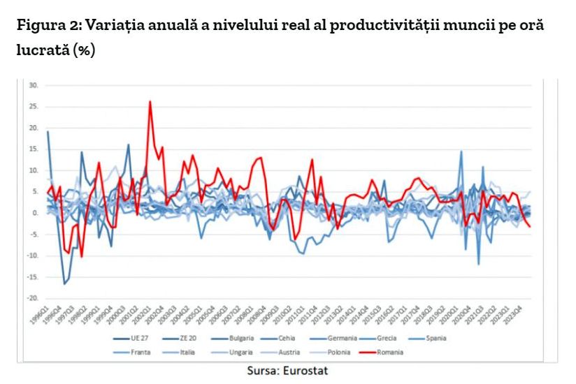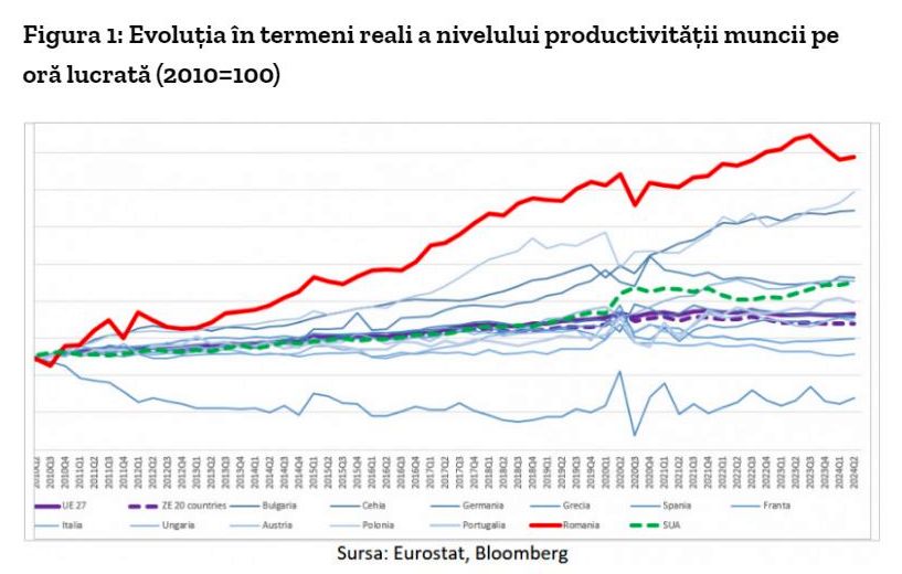 Ultimii ani au reprezentat o perioada complicata, in multe privinte, iar acest lucru a fost si continua sa fie resimtit la toate nivelurile societatii. Din punct de vedere economic, am parcurs multe transformari, am reusit sa evitam o serie de pericole importante si am fructificat unele oportunitati, chiar daca poate nu in aceeasi masura pe cat ne-am fi dorit sau pe cat ar fi fost posibil intr-o situatie mai putin nefavorabila. Dinamica transformarilor si a provocarilor economice si sociale ramane insa foarte accelerata, iar modul in care continuam sa raspundem acestora prin actiuni pe termen scurt si demersuri strategice pe termen lung mentine un impact considerabil asupra dezvoltarii viitoare. Tocmai de aceea, este important sa nu pierdem din vedere faptul ca orice perioada de transformare si provocari structurale comporta si oportunitati de dezvoltare si imbunatatire. Acest lucru este stiut, dar uneori nu se regaseste suficient in abordarile politicilor structurale. De asemenea, este util sa nu uitam sa profitam cat mai bine de avansul important din perioadele anterioare, pentru ca, in pofida faptului ca multe lucruri nu sunt inca la nivelul pe care ni-l dorim, economia Romaniei a progresat foarte mult in ultimii 20 de ani. Nu o arata doar indicatorii; este vizibil in multe ipostaze si este confirmat in discutiile cu investitorii straini si cu expertii cu care colaboram in relatiile internationale. Pentru ca Romania este o parte integrata indisolubil a Uniunii Europene, multe dintre tendintele pe care le observam pe plan local sunt efecte directe sau indirecte ale unor trenduri mai ample ale economiei europene si mondiale pe care le resimtim simultan cu partenerii nostri europeni. Totodata, preocuparile si eforturile comune ale Uniunii sunt adesea oportunitati pentru Romania de a-si exploata avantajele si potentialul in vederea dezvoltarii si mentinerii unui ritm ridicat de convergenta, cu beneficii pentru economie si societate. Din aceasta perspectiva, provocarile cu care se confrunta economia UE, evidentiate o data in plus in raportul prezentat de Mario Draghi, merita sa fie avute in vedere in efortul periodic de reevaluare a politicilor structurale si a planurilor strategice ale Romaniei privind dezvoltarea economica. Este util sa reamintim ca reputatul economist italian a fost, pe rand, director executiv al Bancii Mondiale, vicepresedinte pentru Europa al Goldman Sachs, guvernator al Bancii Italiei, presedinte al Bancii Centrale Europene si prim-ministru al Italiei, acumuland o experienta si o influenta profesionala ce confera o greutate aparte concluziilor pe care le formuleaza in raportul recent publicat. Chiar daca anumite propuneri ale sale nu au generat unanimitati, cred ca este destul de probabil ca de o buna parte dintre recomandarile raportului sa se tina seama in modul in care va fi gestionata continuitatea strategiilor economice de catre reprezentantii nou-alesi ai forurilor europene. De altfel, nu ne aflam in fata primului demers de analiza a decalajelor de dezvoltare si competitivitate cu care se confrunta UE in raport cu alte blocuri economice. Chiar in luna aprilie, un alt fost premier italian, Enrico Letta, a realizat un raport privind viitorul pietei unice si nevoia adaptarii la provocarile globale. Una dintre recomandarile sale cheie era introducerea unei „a cincea libertati” in UE, privind libera circulatie a cunostintelor si inovatiei precum si sprijinirea educatiei. Scopul asociat acestei propuneri era de a consolida infrastructura tehnologica si de cercetare, precum si de a elimina barierele in calea schimbului transfrontalier de cunostinte. Inca de la acel moment, se acorda multa importanta mobilizarii economiilor, promovarii investitiilor, tranzitiei digitale si integrarii in continuare a cadrelor de reglementare aferente acestor domenii. Un element aparte ce se desprindea din Raportul Letta era propunerea de intensificare a cooperarii transatlantice si chiar de realizare a unei „piete unice transatlantice”. Revenind la Raportul Draghi, acesta este centrat pe ideea de recuperare a decalajului de competitivitate constatat in raport cu doua zone economice cheie relevante pentru Europa pe pietele internationale de bunuri si servicii, respectiv Statele Unite ale Americii si Republica Populara Chineza. Relevante pentru Romania sunt insa, in special, caile si actiunile care sunt propuse pentru atingerea acestui obiectiv, dintre care merita amintite: imbunatatirea productivitatii (inclusiv prin digitalizare si fructificarea avantajelor oferite de AI), sporirea investitiilor (in special in tehnologii si mijloace de productie), revizuirea mecanismelor pietei energiei, reducerea fragmentarii pietei unice, utilizarea mai eficienta a resurselor si reducerea dependentelor externe, mai multa suplete si armonizare a cadrului de reglementare, precum si simplificarea cadrului de decizie si coordonare europeana. Asa cum aratam putin mai sus, nici una dintre cele enumerate in Raportului Draghi nu reprezinta preocupari noi la nivel european, insa unul dintre meritele sale este ca le pune intr-o alta perspectiva, evidentiind interconexiunile si necesitatea imperativa de a actiona, mai degraba mai devreme decat mai tarziu. De aceea, consider ca raportul este un nou punct de referinta esential pentru dezbatere, subliniind necesitatea reformelor, chiar si in contextul potentialelor critici din partea diferitelor state membre cu privire la unele dintre concluzii si propuneri. Mai jos vom aborda pe rand cateva dintre temele raportului din perspectiva situatiei actuale a economiei noastre si a perspectivelor de dezvoltare pe care le avem. Unul dintre factorii importanti care influenteaza competitivitatea este productivitatea muncii. Din aceasta perspectiva, situatia Romaniei este una mixta. Figura 1 de mai jos realizata pe baza datelor furnizate de Eurostat si Bloomberg arata ca in Romania, cumulat pentru perioada 2010-2023, avansul in termeni reali al nivelului productivitati