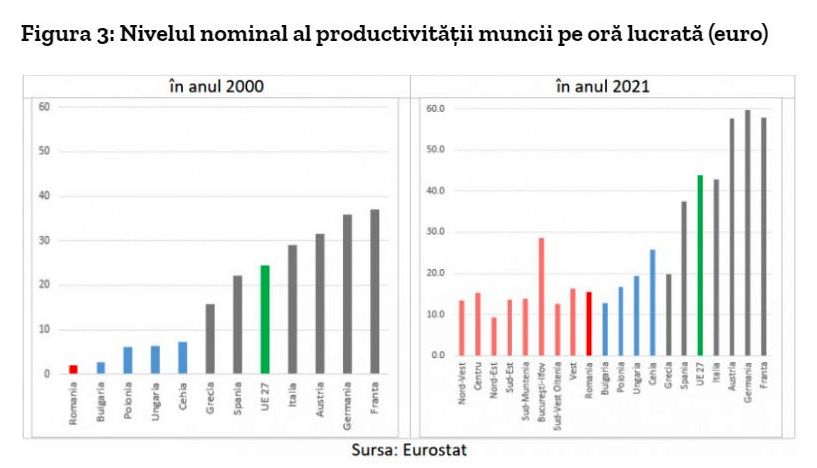 Astfel, desi dinamica productivitatii in Romania a fost mai accelerata pe ansamblul perioadei, totusi nivelul nominal consemnat in anul 2021 era in continuare mai redus fata de cel din Polonia, Ungaria si Cehia, chiar daca decalajul s-a redus semnificativ fata de cel existent cu 20 de ani in urma. Ca in numeroase alte tari europene, exista si in Romania o discrepanta importanta intre nivelurile productivitatii aferente regiunilor, zona capitalei fiind aproape in toate cazurile cea care statistic concentreaza valori adaugate mai mari si implicit un nivel de productivitate mai ridicat (dupa cum se observa in partea din dreapta a Figurii 3).