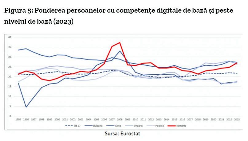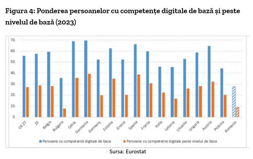 O alta observatie este ca zona de nord-est se claseaza si dupa acest criteriu pe locul cel mai nefavorabil intre regiunile Romaniei, ceea ce nu surprinde, avand in vedere investitiile si capacitatile de productie mai reduse si mai putin evoluate tehnologic, cu doar putine exceptii, pe care a reusit sa le atraga in ultimele decenii. In medie, la nivel national ramanem semnificativ mai jos fata de multe tari din jur, cu care ne aflam in competitie directa pe piata unica europeana (principala destinatie a exporturilor noastre). Asadar, exista in continuare mult spatiu pentru cresterea productivitatii, asa cum o demonstreaza nivelul pe care il consemneaza in prezent economii din vecinatate, precum cea a Ungariei si Cehiei. Doua dintre solutii, pe termen mediu si lung, sunt imbunatatirea calificarii fortei de munca si, respectiv, cresterea capacitatilor tehnologice. Pentru prima dintre ele, drumul de urmat este adaptarea continua si sporirea in timp a nivelului de formare, atat de baza, cat si specific profesional, al fortei de munca. Este un obiectiv permanent, dar la care, din pacate, am ramas semnificativ in urma in ultimii ani. Pentru cea de-a doua, continuarea investitiilor este de cea mai mare importanta, aici se fac pasi importanti in perioada curenta, iar avansul a fost unul semnificativ, insa trebuie sa adresam riscul tot mai vizibil de incetinire a acestora din multiple cauze. In ceea ce priveste gradul de pregatire a fortei de munca, o serie relevanta de indicatori care arata perspectivele pe termen lung, mai ales in contextul noii economii, sunt cei referitori la competentele digitale. De altfel, digitalizarea este una dintre ariile abordate pe larg de raportul Draghi, tocmai pentru ca exista asteptari ca avansul tehnologiilor digitale sa contribuie la un plus de productivitate la nivel global. Romania inca puncteaza foarte bine la criterii legate de disponibilitatea internetului de mare viteza si tehnologiile utilizate pentru conectare, dar si alte tari au recuperat din decalajul pe care il aveau in urma cu mai multi ani. De exemplu, la finele anului 2023, gospodariile populatiei dispuneau de conexiune la internet cu viteza de cel putin 1 gigabit pe secunda in proportie de 95% in Romania, 82% in Ungaria si 75% in Polonia (date Eurostat). Din pacate, in Romania avantajul conectivitatii a fost pana in prezent exploatat pe deplin in mare parte doar de companiile din sectorul serviciilor IT si de specialistii in domeniu (inginerii IT, programatorii etc.). Intr-adevar, valoarea adaugata creata de aceste segmente a contribuit incontestabil la cresterea PIB si la excedentul de balanta comerciala al serviciilor in ultimii ani. Din pacate insa, tendintele curente indica o incetinire pentru acest sector, la nivel international si european. In contrapondere, se prefigureaza o crestere semnificativa a importantei competentelor digitale de baza si de nivel mediu, deoarece, cu cat o pondere mai mare a fortei de munca dispune de astfel de pregatire, cu atat productivitatea muncii ar putea creste in contextul adoptarii pe scara larga a noilor tehnologii in tot mai multe domenii ale activitatii economice. De aceea, este important sa largim baza de fructificare a accesului favorabil la internet, profitand de acest avantaj pentru a spori calificarea actualei si viitoarei generatii de angajati. De altfel, in lumea actuala, este oricum greu de imaginat un proces de educare si formare si educare care sa nu implice competente digitale cel putin la nivel de baza. Din aceasta perspectiva, din pacate, Romania se plaseaza in prezent pe ultimele pozitii in UE si la un nivel foarte redus in ceea ce priveste ponderea populatiei care detine competente digitale cel putin la nivelul de baza, asa cum rezulta din Figura 4 de mai jos.