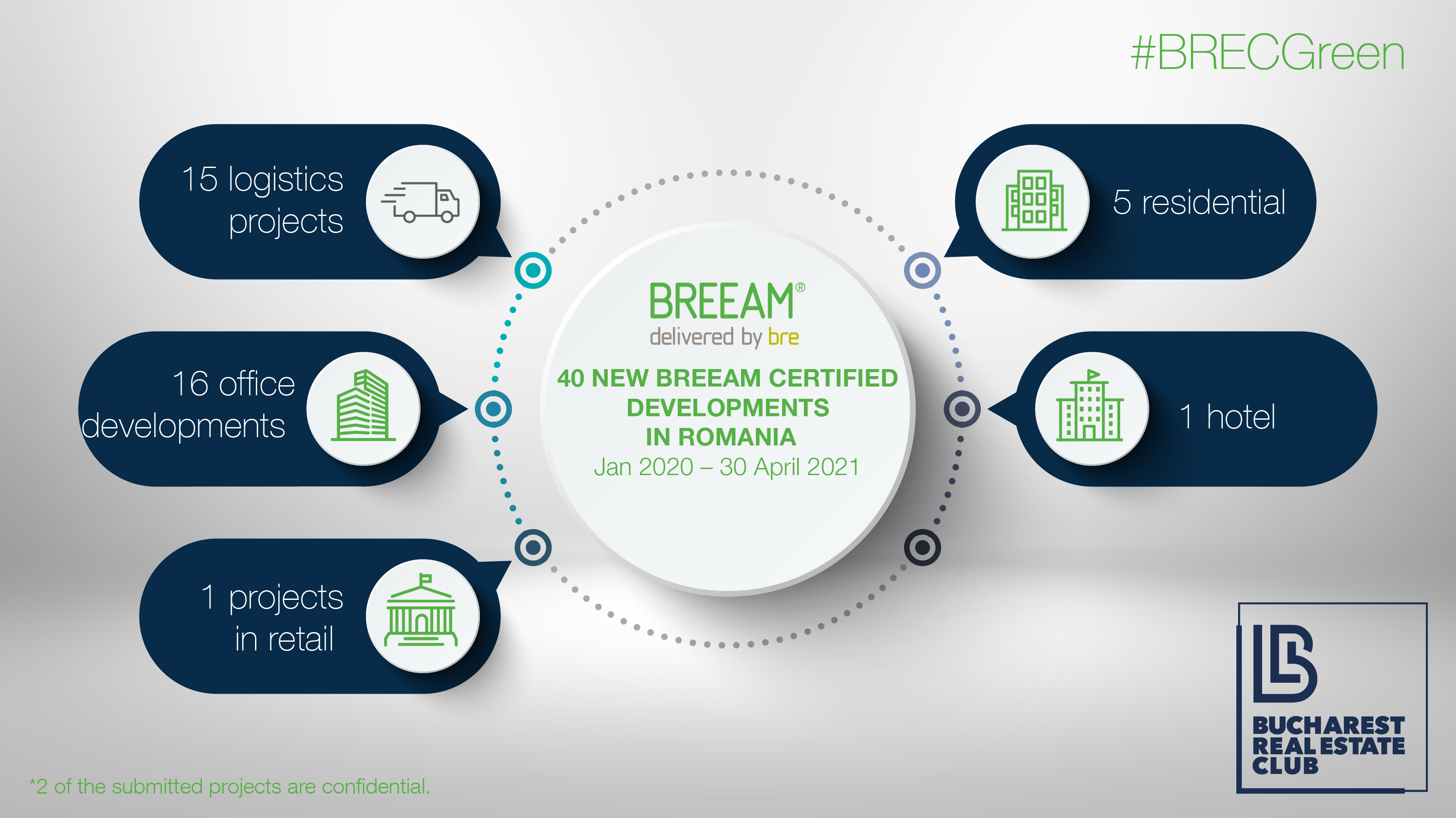 Un numar de 40 de proiecte imobiliare au fost certificate BREEAM in perioada ianuarie 2020 – aprilie 2021, conform datelor transmise de BRE Group UK (organizatia din Marea Britanie care acorda certificarea de sustenabilitate BREEAM) catre BUCHAREST REAL ESTATE CLUB (BREC). Dintre acestea, 16 sunt cladiri si parcuri de birouri si 15 sunt parcuri logistice sau centre logistice ale marilor retaileri.Segmentul rezidential numara mai putine certificari BREEAM in perioada analizata (5 proiecte rezidentiale, majoritatea din afara Bucurestiului). Un singur proiect de retail a obtinut certificarea BREEAM (IKEA Pallady Store – BREEAM Excellent) si, de asemenea, un singur hotel a obtinut calificativul BREEAM Excellent in aceasta perioada – hotelul Radisson BLU din Brasov.