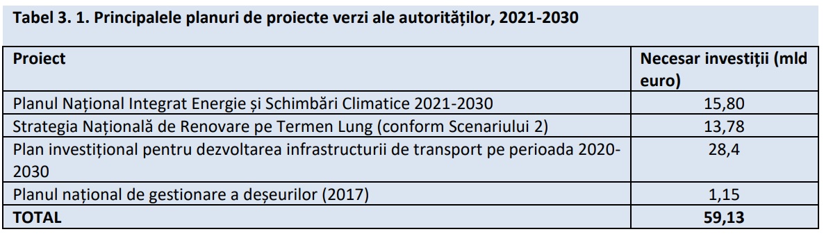 Proiecte cu o valoare totala de aproape 60 miliarde euro vor fi implementate de autoritati publice si private pana in anul 2030, potrivit calculelor Grupului de lucru din Comitetul National pentru Supravegherea Macroprudentiala (CNSM) si prezentate in raportul anual al organizatiei. Spre comparatie, suma reprezinta totalul investitiilor derulate de sectorul public in ultimii opt ani (63,5 miliarde euro in intervalul 2013-2020) sau totalul alocarilor de fonduri europene din ultimele doua cicluri financiare multianuale (64 miliarde euro, intervalul 2007-2020). Unele proiecte sunt planificate a beneficia de finantare din fonduri europene, iar efectul de antrenare in economie ar putea fi consistent.