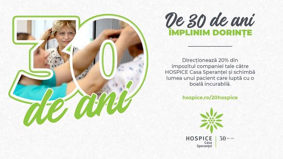 Companiile pot veni in sprijinul pacientilor cu boli incurabile ingrijiti de fundatia HOSPICE Casa Sperantei prin facilitatea fiscala care le permite sa directioneze pana la 20% din impozitul pe profit sau pe venit datorat statului, pana la 31 decembrie. Fondurile stranse astfel asigura continuitate ingrijirii paliative gratuite de care tot mai multi pacienti din Romania au nevoie.