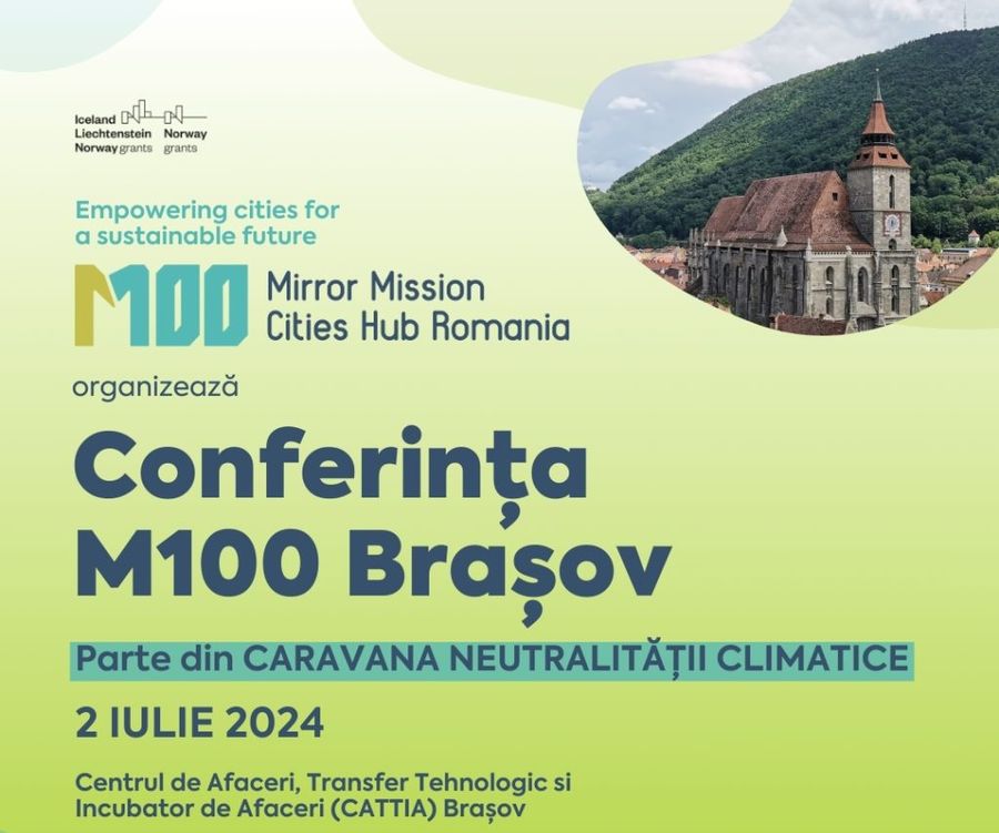 Prima initiativa a Platformei M100, proiectul „Towards Climate-Neutral and Smart Cities through Mutual Learning, Engagement and Capacity-Building”, a venit catre orasele eligibile pentru a le prezenta Misiunea M100 pentru orase neutre climatic si Apelul deschis pentru 10 orase din Romania, prin Caravana Neutralitatii Climatice M100. Prima oprire a Caravanei M100 a fost la Brasov, la Centrul de Afaceri, Transfer Tehnologic si Incubator de Afaceri CATTIA, pe 1 si 2 iulie.Pe 2 iulie a avut loc prima Conferinta M100 Mirror Mission Cities Hub Romania – un eveniment care a adus la un loc reprezentanti ai autoritatilor locale din zona, ai mediului privat, dar si ai unor organizatii nonguvernamentale si initiative locale care joaca deja un rol important in ecosistemul local si isi doresc sa se implice, prin proiectele desfasurate, in indeplinirea obiectivelor M100.