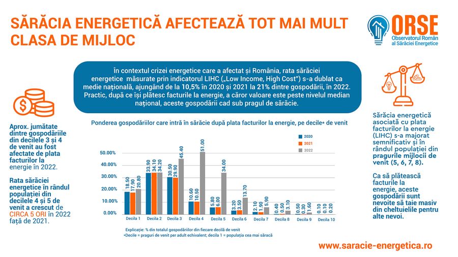 Pentru tot mai multi romani, plata facturilor la energie a devenit o povara ridicata, in contextul cresterii preturilor energiei si erodarii puterii de cumparare cauzate de inflatie. Mai mult, saracia energetica afecteaza nu doar populatia cea mai saraca, ci este un fenomen care a crescut alarmant si in randul populatiei cu venituri medii. Rata saraciei energetice masurate prin indicatorul LIHC („Low Income, High Cost”) arata ca aproximativ jumatate dintre gospodariile din decilele 3 si 4 de venit au cazut anul trecut in saracie dupa plata facturilor la energie, acestea fiind cele mai afectate categorii. De asemenea, rata saraciei energetice in randul gospodariilor din decilele 4 si 5 de venit a crescut de circa cinci ori in 2022 fata de 2021, arata un studiu efectuat de Observatorul Roman al Saraciei Energetice (ORSE), pe baza datelor cuprinse in Ancheta Bugetelor de Familie realizata de Institutul National de Statistica.Indicatorul LIHC este unul dintre principalii indicatori folositi pentru masurarea saraciei energetice in randul populatiei. Acest indicator nu reflecta neaparat incapacitatea acestor gospodarii de a se incalzi, ci arata ca facturile la energie au un impact foarte ridicat in bugetul acestora. Practic, dupa ce isi platesc facturile la energie, a caror valoare este peste nivelul median national, aceste gospodarii cad sub pragul de saracie monetara.