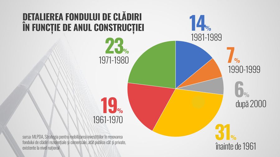 Mai detaliat, o treime (35%) din parcul imobiliar al UE are mai mult de 50 de ani vechime si peste 40% din parcul imobiliar a fost construit inainte de 1960. Asadar, majoritatea cladirilor existente sunt vechi si ineficiente din punct de vedere energetic, pe fondul lipsei unor standarde si reglementari in domeniu la acea vreme.