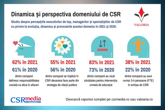 Valoria impreuna cu CSRMedia.ro au lansat a opta editie a studiului Dinamica si Perspectiva Domeniului CSR din Romania. Rezultat al parteneriatului dintre cele doua organizatii, studiul ajuns la editia a noua este o analiza comparativa a evolutiei conceptului de responsabilitate sociala corporativa si se adreseaza specialistilor de CSR, dar mai ales managerilor si directorilor executivi care isi doresc sa inteleaga evolutia acestui domeniu.Rezultatele editiei curente indica o fireasca cautare a modalitatilor de raspuns a echipelor de CSR la provocarile aduse de anul 2021, cel in care am aflat cum arata noua normalitate.