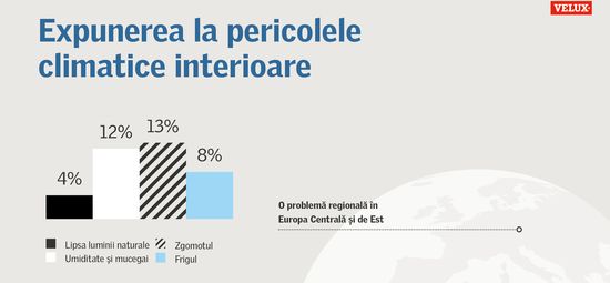 Potrivit studiului Barometrului Locuintelor Sanatoase 2022 realizat de VELUX, 32% dintre romani sunt expusi in prezent la un risc climatic in interiorul locuintelor, precum: umezeala sau mucegai, temperaturi scazute, zgomot excesiv sau lipsa luminii naturale. Conform concluziilor la care au ajuns expertii, reducerea riscurilor climatice la interior, care afecteaza direct calitatea vietii si sanatatea romanilor, se poate face prin renovarea corespunzatoare la interior a cladirilor, fapt care va aduce tarii noastre un total de 6,3 miliarde de euro beneficii economice cumulate pana in anul 2050.Raportul desfasurat de VELUX, in parteneriat cu compania de cercetare RAND Europe, mai arata ca 9% dintre romani traiesc in locuinte cu acoperisuri cu scurgeri si pereti umezi predispusi la mucegai, podele si ferestre putrezite care pot provoca astm si probleme respiratorii. De asemenea, 20% dintre persoanele cu venituri mici din Romania nu pot mentine o caldura adecvata in casa, ceea ce poate provoca afectiuni cardiovasculare sau respiratorii. In plus, 18% dintre romani sunt expusi zgomotului de la vecini sau de pe strada, iar 4% considera ca locuinta lor este prea intunecata, ceea ce poate duce la depresie si probleme de somn.