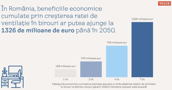 Studiul arata, de asemenea, ca beneficiile economice ale renovarilor pot fi masurate nu doar in contextul proprietatilor rezidentiale: cresterea vitezei de ventilatie in birouri cu 1 l/s poate genera economii nete de 189 milioane de euro pentru Romania pana in 2050, si pot ajunge pana la 1,3 miliarde de euro, in cazul in care rata de ventilatie este crescuta semnificativ (7 l/s).