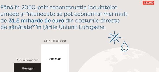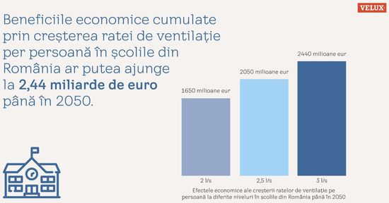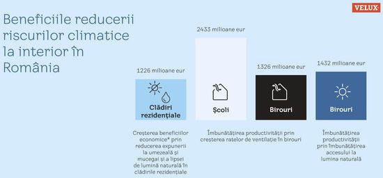 Potrivit studiului VELUX, reducerea riscurilor climatice la interior prin renovarea corespunzatoare a cladirilor ar genera economii totale de peste 6,3 miliarde euro pentru Romania pana in 2050, astfel: 801 milioane euro la cheltuielile cu asistenta medicala, 425 milioane euro la sanatate si productivitate, 2,4 miliarde de euro pentru scoli si 1,3 miliarde de euro, respectiv 1,4 miliarde de euro pentru birouri, datorita productivitatii crescute in imobile mai bine ventilate si cu mai multa lumina naturala. Luand in considerare acesti indicatori pentru toate statele membre UE, economiile totale ale Europei pana in 2050 se ridica la 608 miliarde de euro.