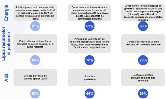 In multe dintre subiectele abordate in barometru, se constata un consens clar cu privire la solutiile ecologice care au fost testate, existand un nivel ridicat de acceptare pentru aplicarea schimbarilor necesare (fie ca este vorba de initiative legate de energie, de protectia resurselor sau de apa).